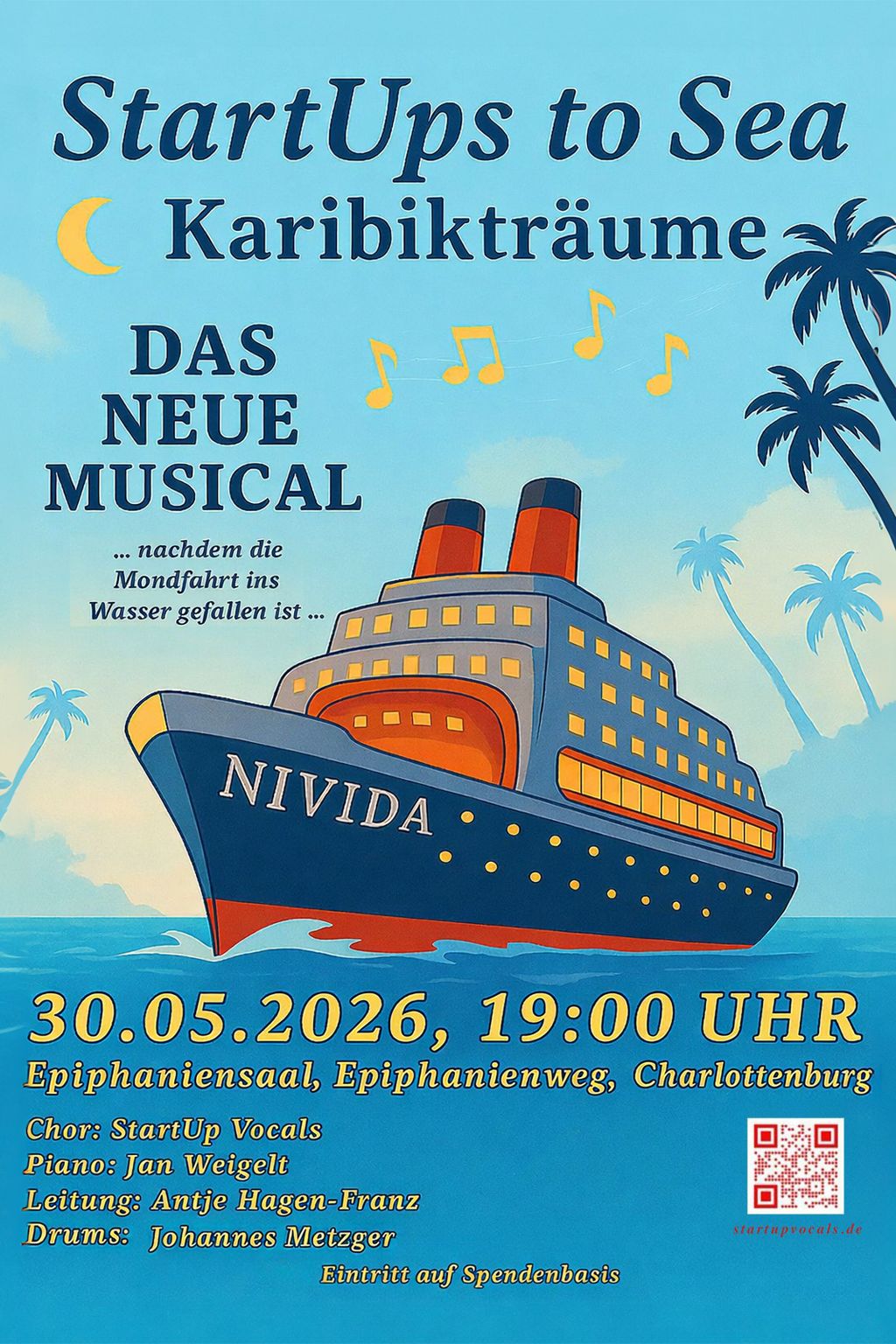„Nachdem der Flug auf den Mond kurz vor dem Start geplatzt war, begeben sich die StartUp Vocals nun auf eine Kreuzfahrt in die Karibik. Die Vorfreude ist groß! Doch an Bord des Schiffes NIVIDA kommt alles anders als erwartet… Lassen Sie sich überraschen! Tauchen Sie mit uns ein in das komisch-verrückte Abenteuer der StartUp Vocals auf hoher See“